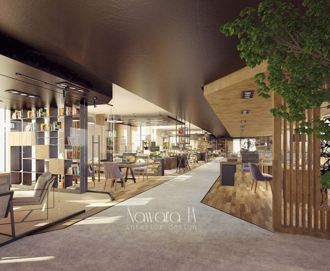 Another project I like is the Industrial Offices project distinguished with the usage of natural and raw elements of wood, concrete, and the plentiful use of plants. This project focuses on the notion of hot desking, open offices, relax areas, and greenery environment for more productive workflow.