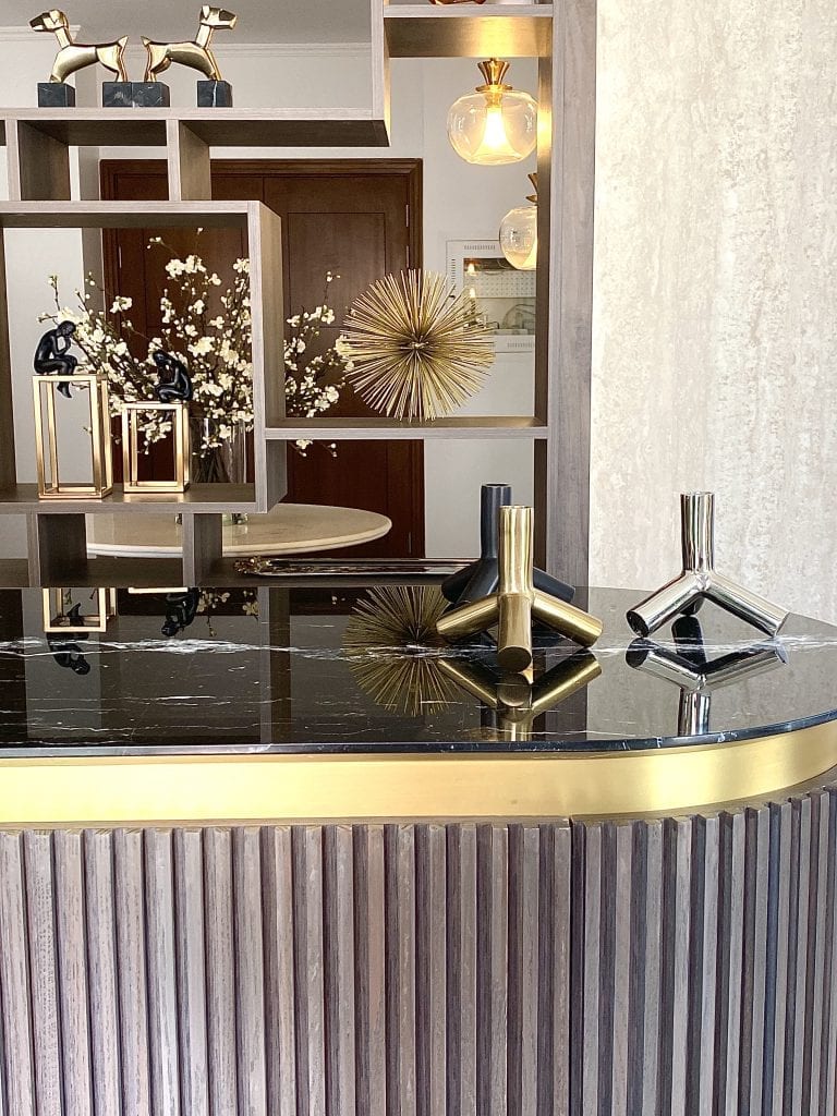 Mudon is a villa community in Dubai. A couple approached me to redesign their home in Mudon. They wanted an elegant entrance with modern yet high on design home. My team and I revamped their villa keeping in mind just that. We started with completely gutting the floors and existing kitchen. We installed custom German kitchen with high end appliances and custom designed most of their furniture. Marble, metal and textured fabric were some of the key elements to elevate their space and give a sense of luxury.