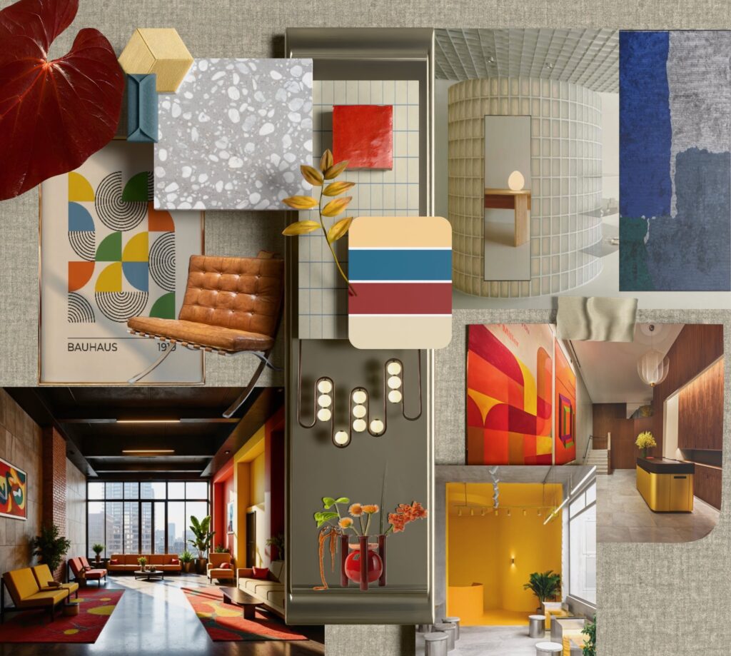 Bauhaus inspired however the tonal take on the colour scheme elevates this sample board giving more of a luxurious feel. Indication of forms, materiality and other elements of design communicates a cohesive, welcoming proposal for this hotel lobby space.