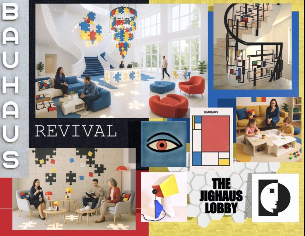 The Jighaus is a playful yet relevant interpretation of Bauhaus inspiration that leans into connectivity through jigsaw forms and the recognisable primary coloured Bauhaus scheme.
